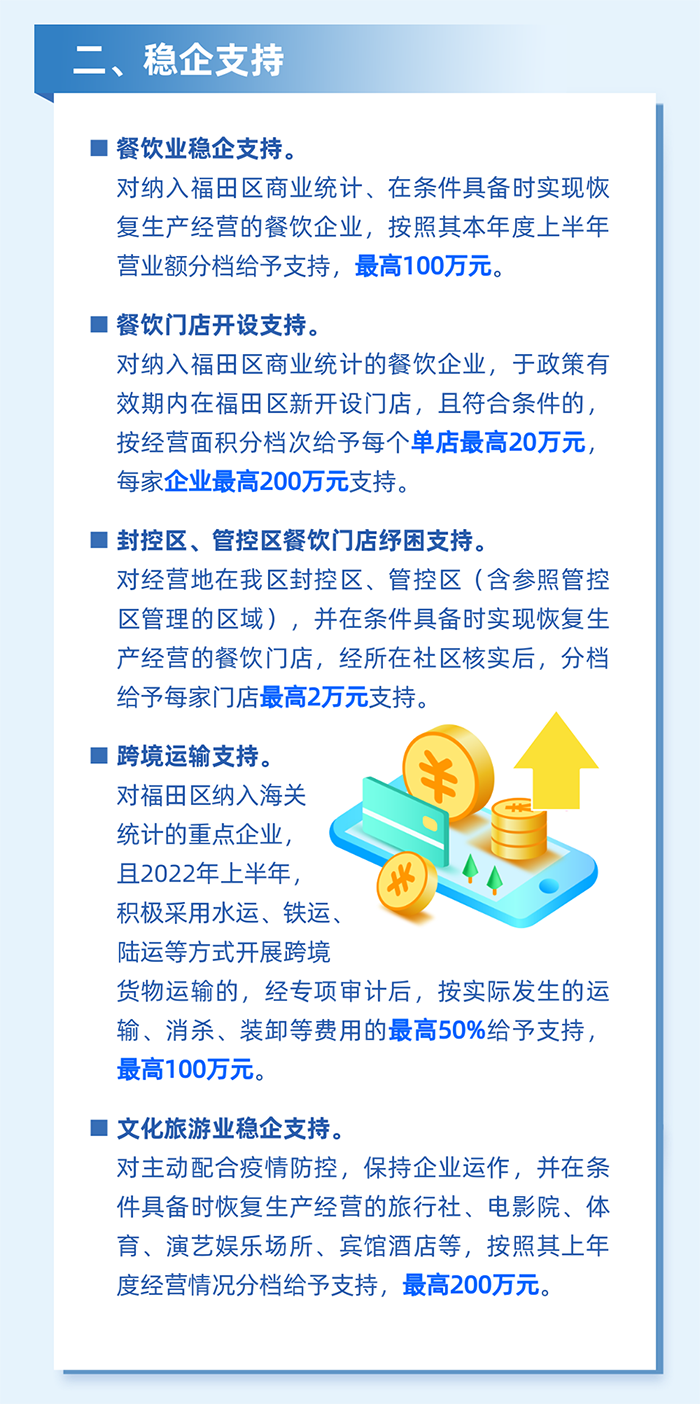 9.對南山區住宿餐飲、交通運輸、文化旅游、零售、體育等行業的重點企業在2022年2月16日至4月30日,通過融資性擔保機構擔保獲得銀行貸款的,按實際支付擔保費用最高50%給予資助,每家企業不超過20萬元。(責任單位:區金融發展服務中心)